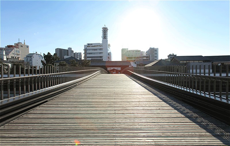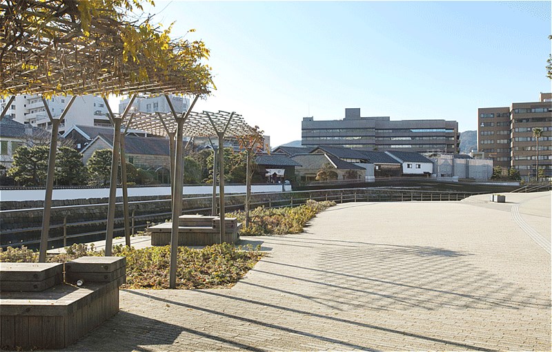 Dejima Omotemonbashi (Main Gate bridge) is 38.5 meters long and 4.4 meters wide. It connects Dejima to Edo-machi. The contemporary design and engineering is an eye-catching connection between the past and the present . Main Gate Bridge Park is located on the opposite bank of Dejima island, with easy access to the harbor, tourist facilities, and downtown areas. It is a much loved place to relax for tourists and citizens alike.